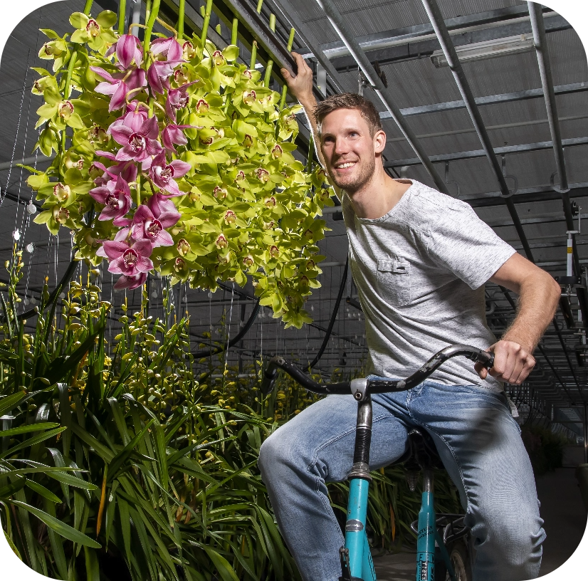 Onze kas is verdeeld in zeven teeltgedeelten die elk ongeveer acht weken bloeien. Dit slimme ritme zorgt ervoor dat, zodra één gedeelte is geoogst, het volgende alweer in bloei staat. Dankzij dit systeem kunnen we het hele jaar door verse cymbidiums leveren. Altijd van dezelfde kwaliteit en altijd met dezelfde aandacht.